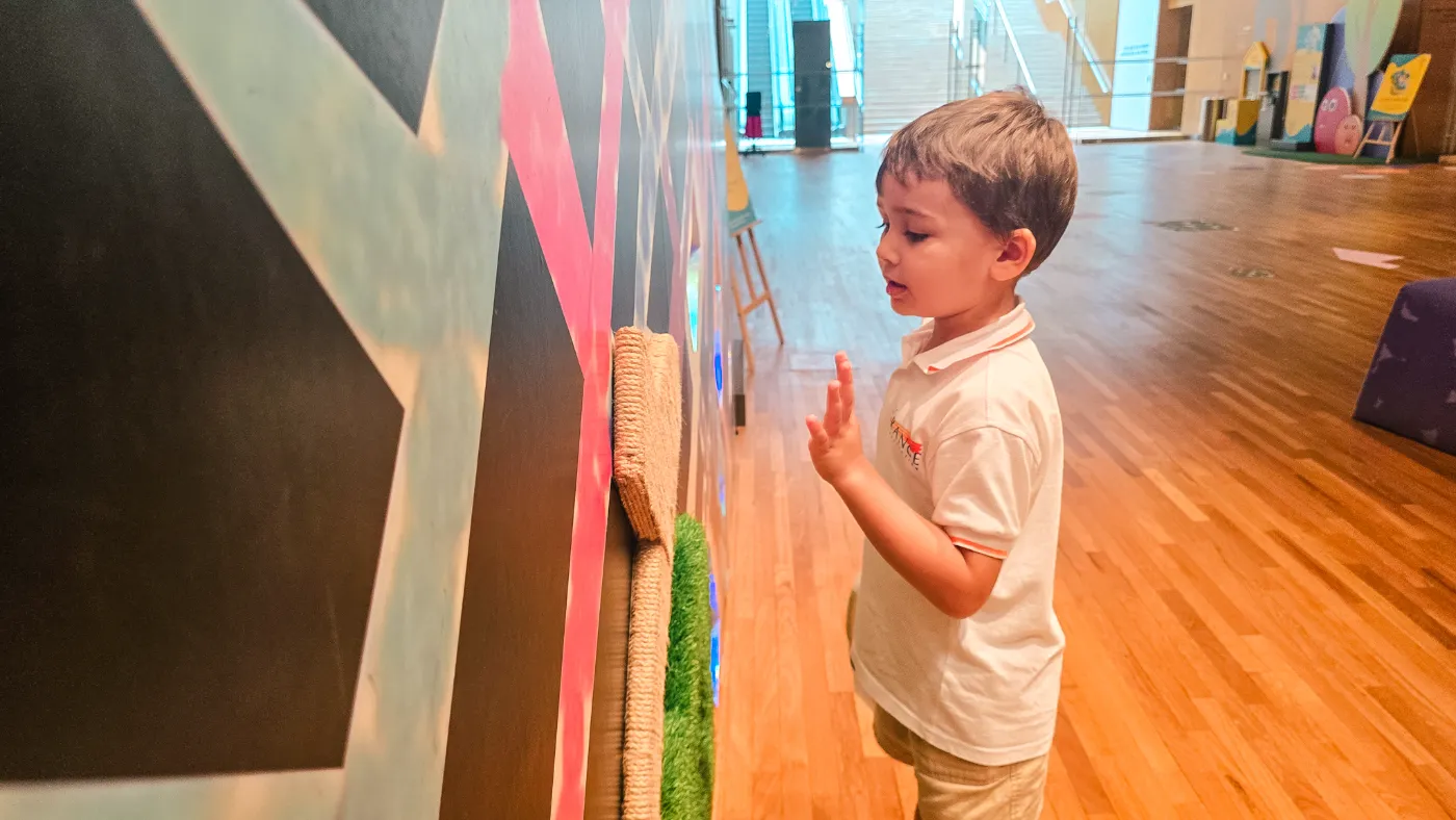 Preschooler from The Grange International Preschool interact with a tactile wall at the Gallery